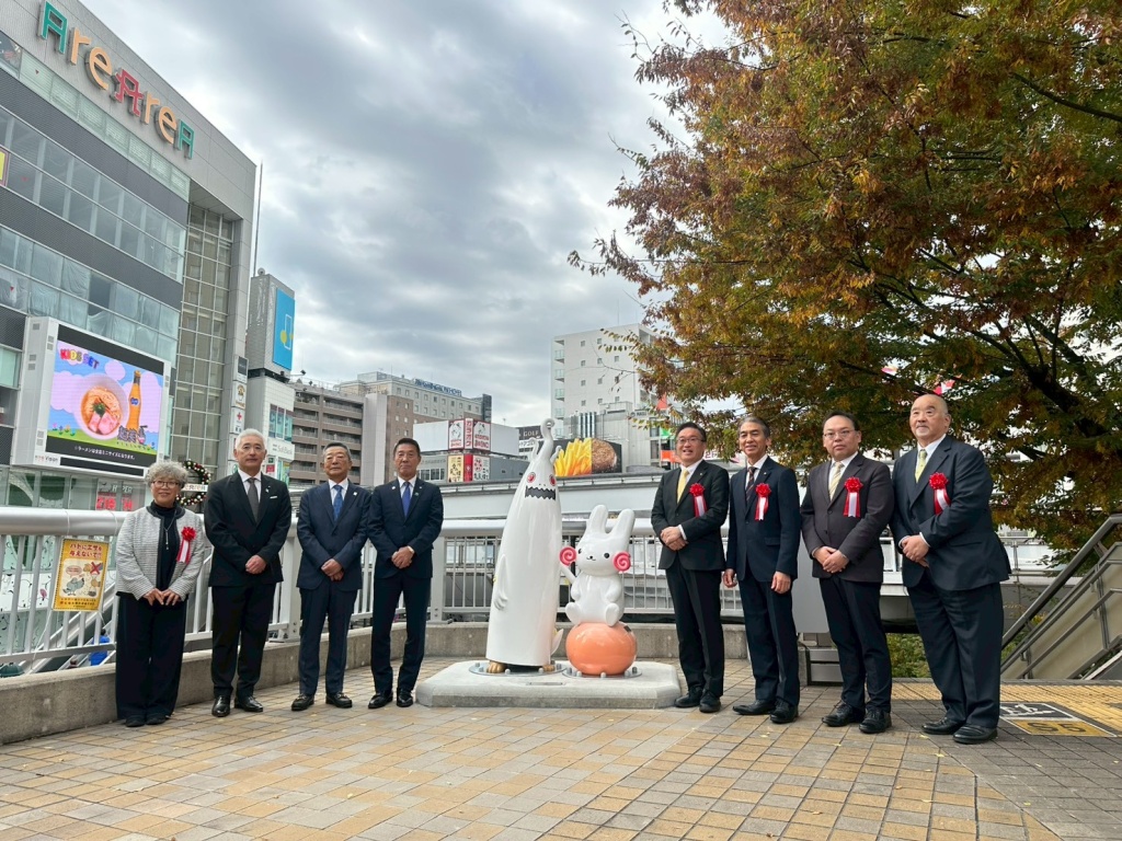 11月18日、JR立川駅南口デッキにて、立川市キャラクター「くるりん」と、壽屋がプロデュースする立川市公認なりそこねキャラクター「ウドラ」が並ぶモニュメント『出逢い』の除幕式が行われました。